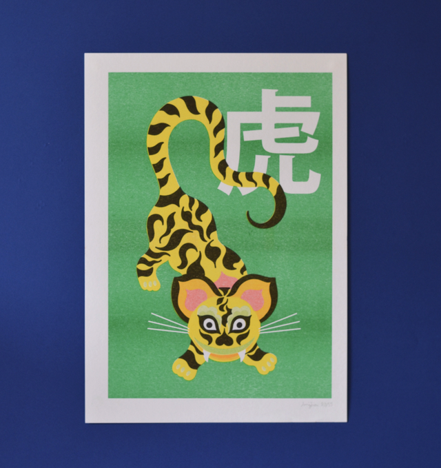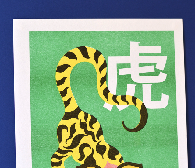 Le tigre est imprimé en jaune, rouge, vert et noir.