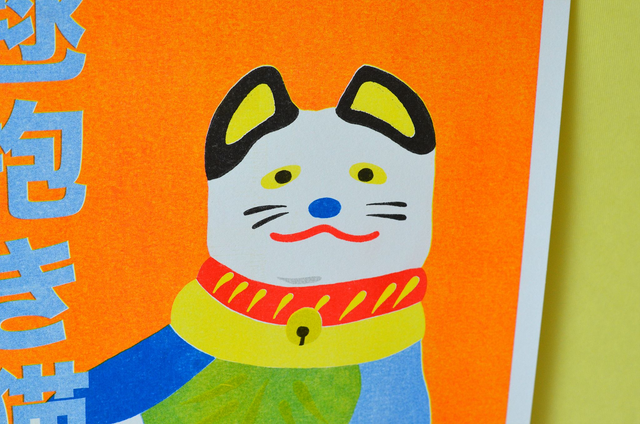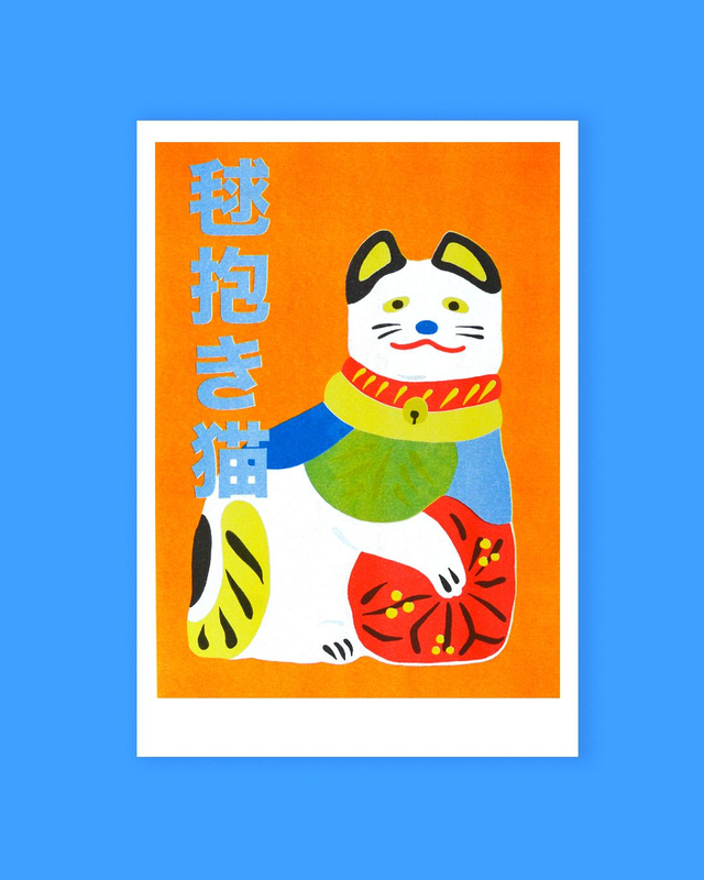 Les jouets folkloriques du Japon. Affiche imprimée en risographie Le chat à la balle
