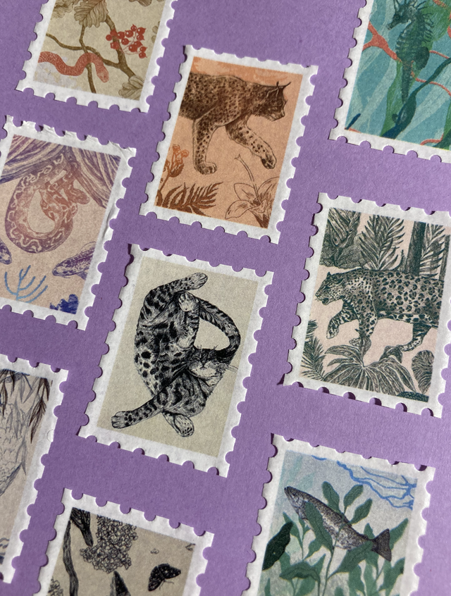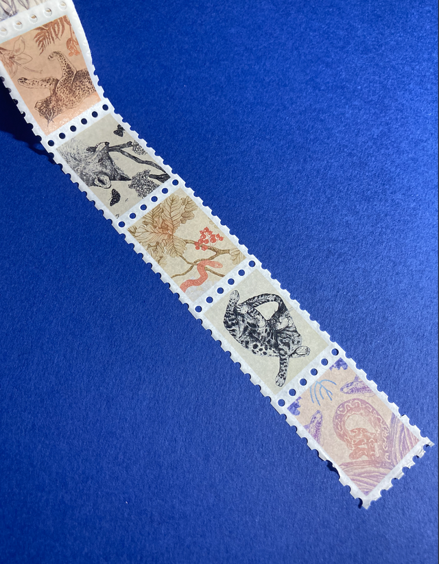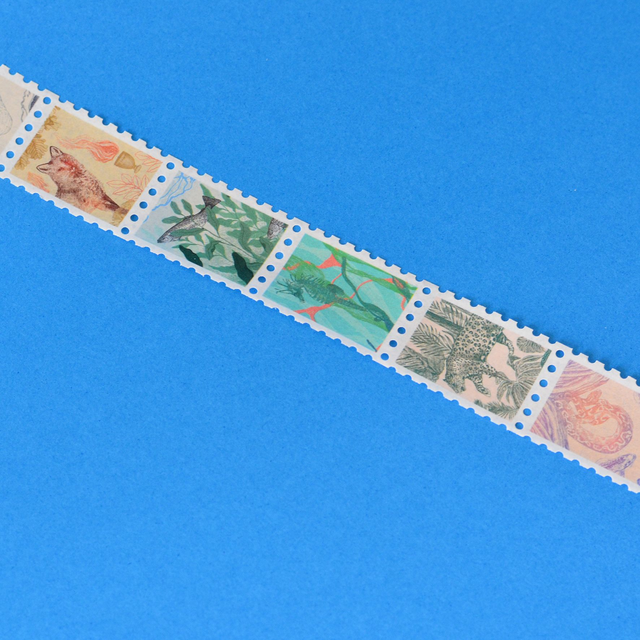 Washi tape illustré et décoratif en forme de timbre avec 10 animaux : renard, cygne, lynx, hippocampe, serpent, chat, truite et léopard.